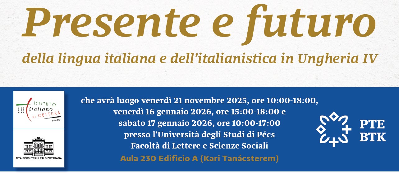 Il Dipartimento di Italianistica della Facoltà di Lettere e Scienze Sociali dell’Università di Pécs, in collaborazione con l’Istituto Italiano di Cultura di Budapest, organizza il 21 novembre 2025 e il 16–17 gennaio 2026 la quarta edizione della conferenza e formazione internazionale intitolata Presente e futuro della lingua italiana e dell’italianistica in Ungheria.